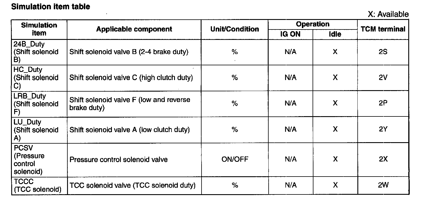 ^ If there is no operation sound from the solenoid after the simulation function inspection is performed, it is possible that there is an open or short circuit in the wiring harness, or solenoid, or sticking and operation malfunction.