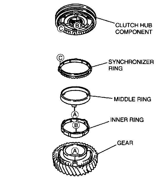^ Do not damage the synchronizer ring when installing the clutch hub component.