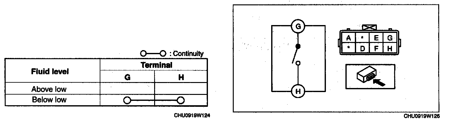 2. Inspect for continuity between the washer fluid-level sensor terminals using an ohmmeter.