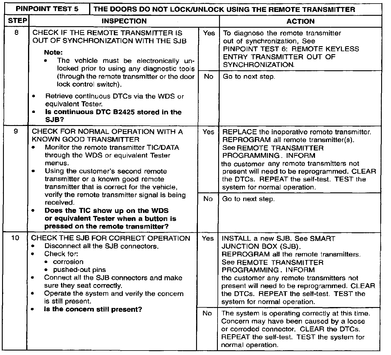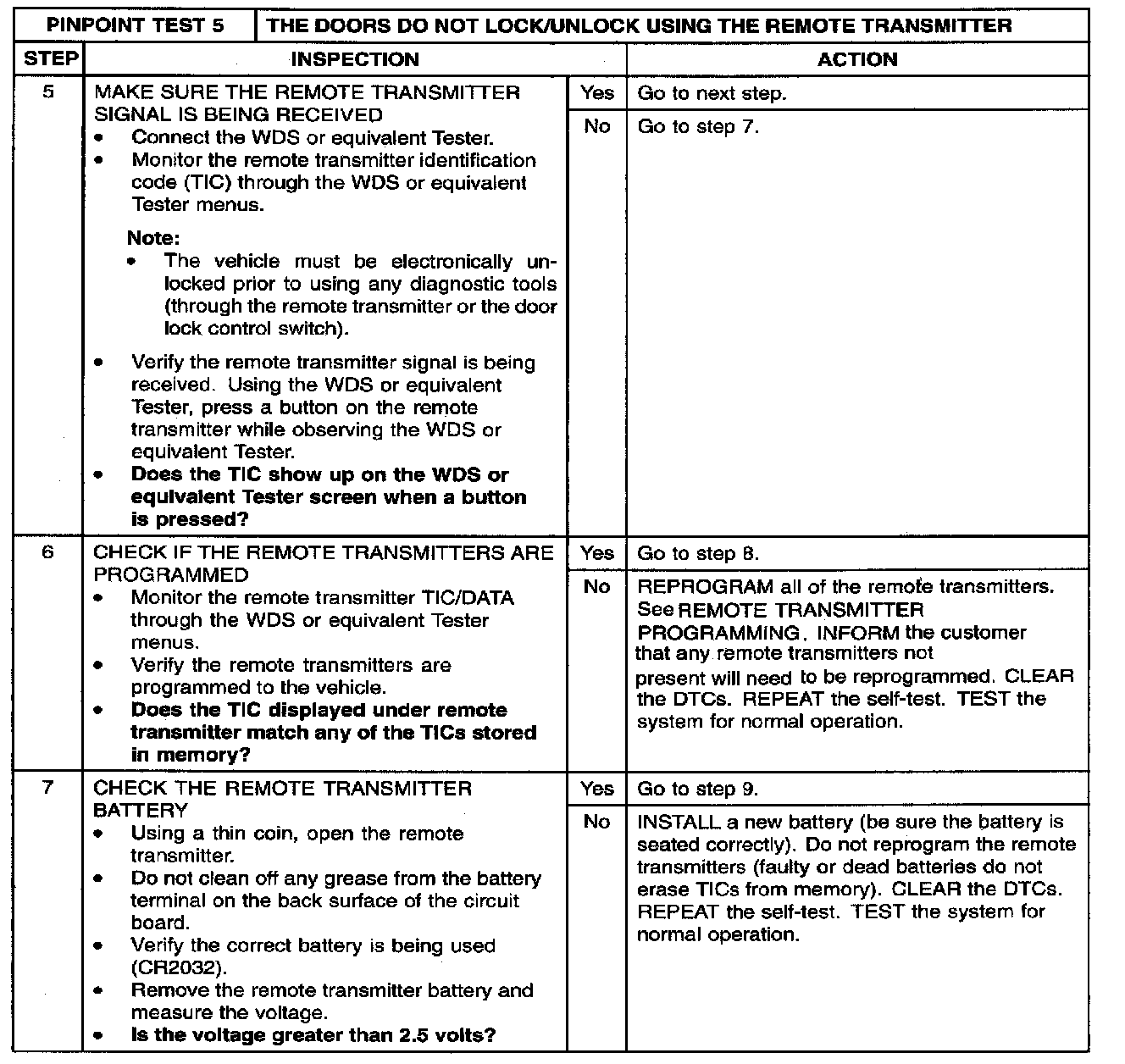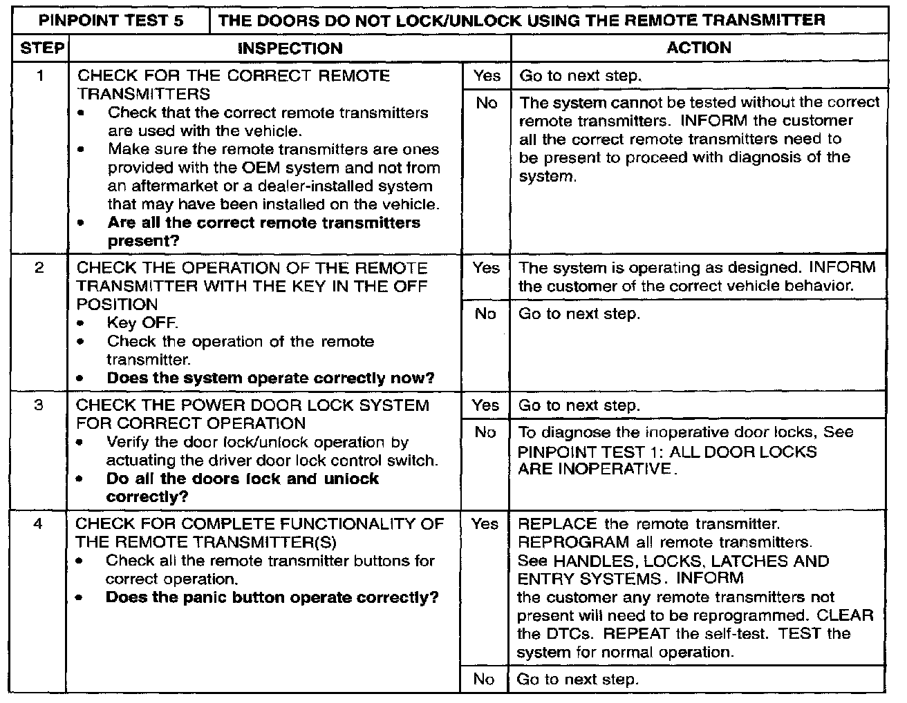 PINPOINT TEST 5: THE DOORS DO NOT LOCK/UNLOCK USING THE KEYLESS ENTRY REMOTE TRANSMITTERStep 1 - 4: