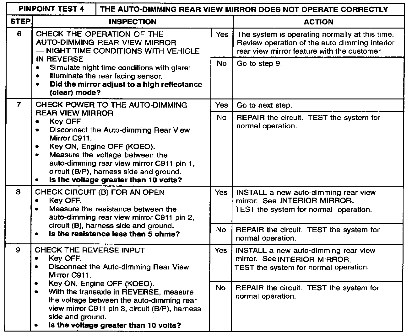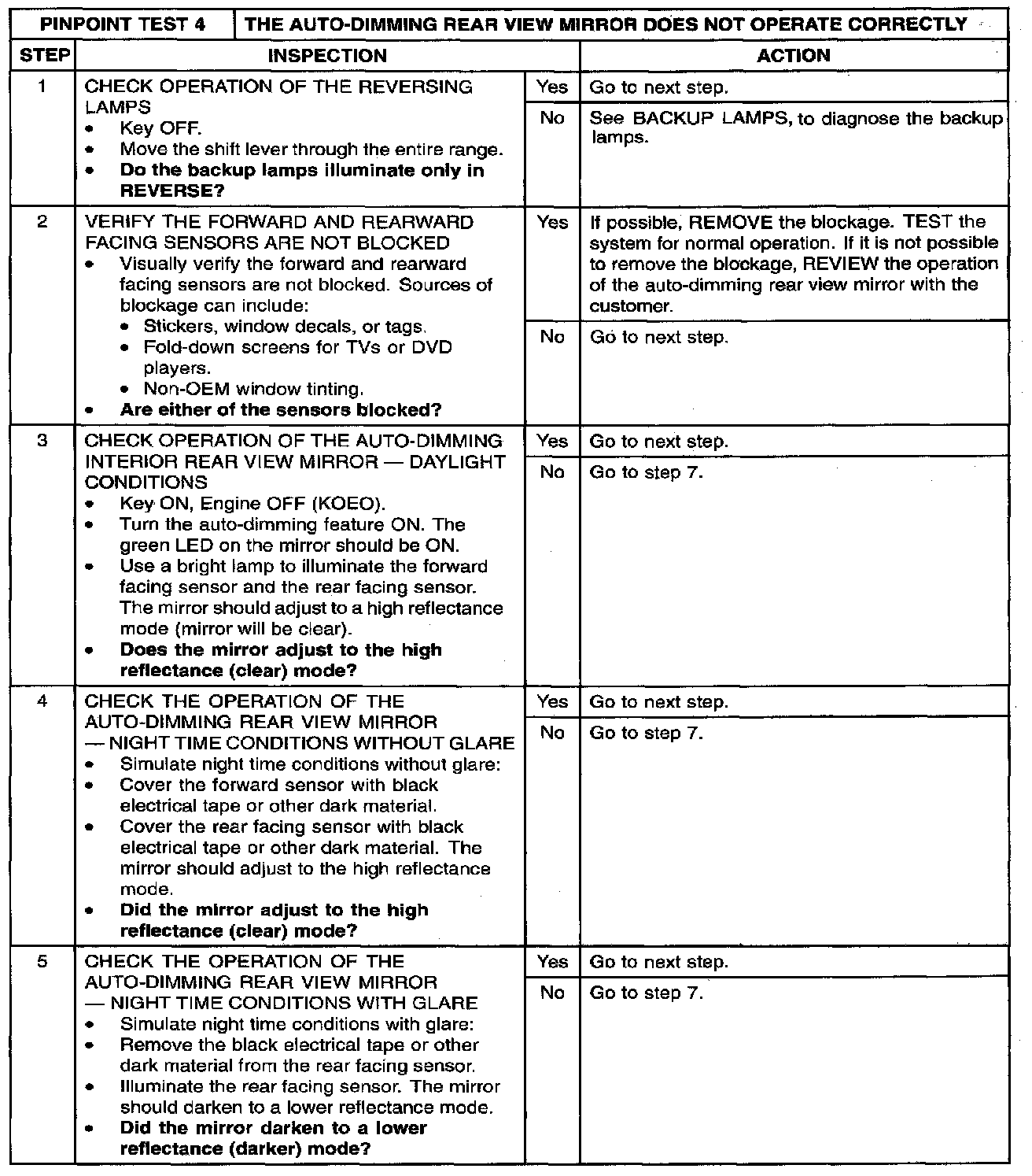 PINPOINT TEST 4: THE AUTO-DIMMING REAR VIEW MIRROR DOES NOT OPERATE CORRECTLYStep 1 - 5: