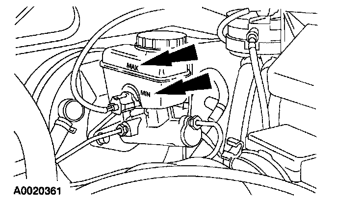 BRAKE SYSTEM LEAK CHECK1. Check the brake fluid level. If the fluid level is below the MIN line on the brake master cylinder reservoir add the necessary amount of DOT 3 brake fluid.