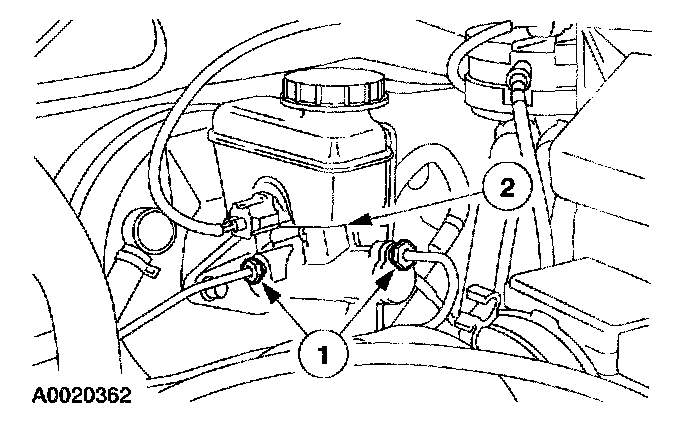 2. Inspect the (1) brake line nuts and the (2) brake master cylinder reservoir for fluid leaks.