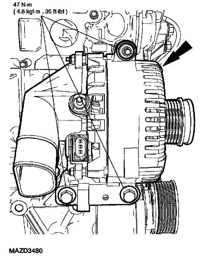 97. Connect the generator electrical connections and install the nut.