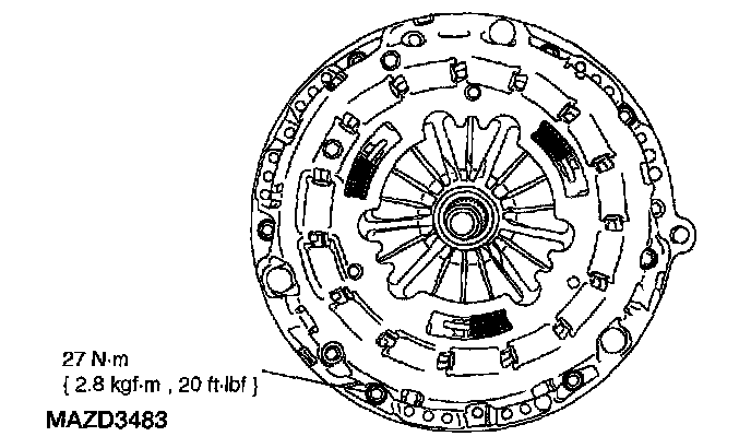 106. Position the clutch pressure plate and install the bolts. Tighten the bolts in a star pattern sequence.