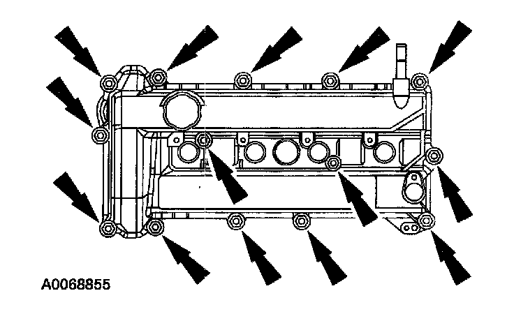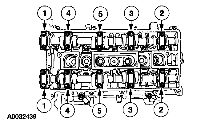 64. Remove the camshafts from the engine. Loosen the camshaft bearing bolts in the sequence shown, one turn at a time. Repeat until all the tension is released. Remove the camshaft bearing caps. Remove the camshafts.
