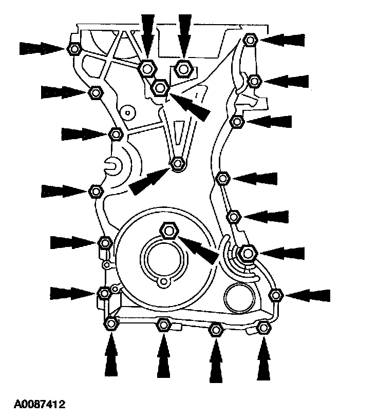55. Remove the bolts and the engine front cover.