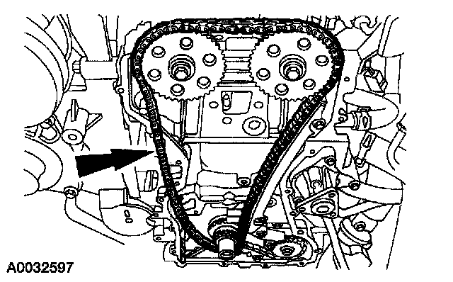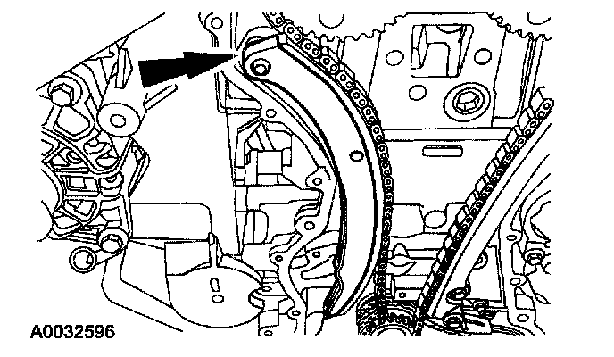 1. Compress the timing chain tensioner, and insert a paper clip into the hole to retain the tensioner.