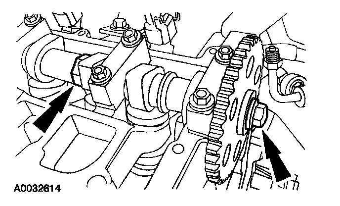 60. Using the flats on the camshaft to prevent camshaft rotation, remove the bolts and the camshaft sprockets.