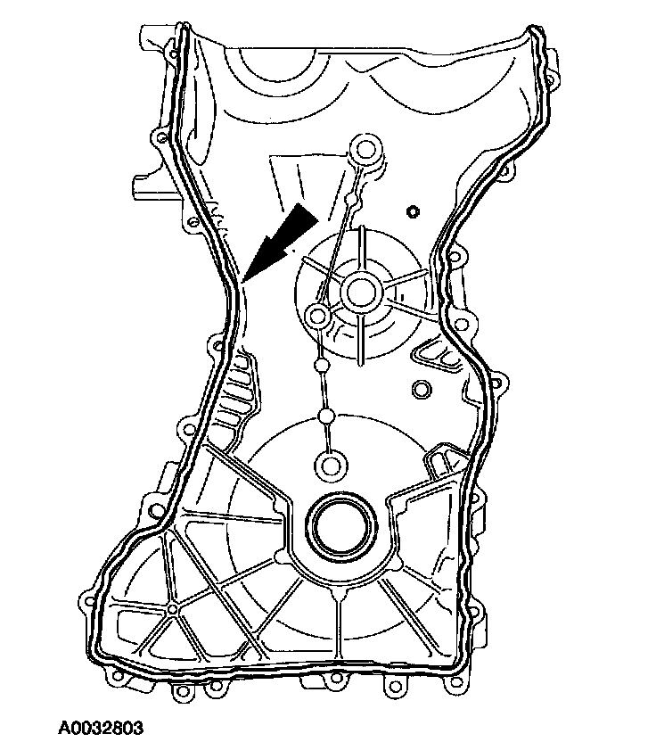 2. Apply a 2.5 mm bead of silicone gasket and sealant to the cylinder head and oil pan joint areas. Apply a 2.5 mm bead of silicone gasket and sealant to the front cover.