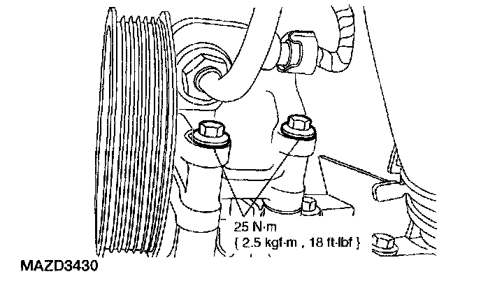 8. Position the power steering pump and install the bolts.