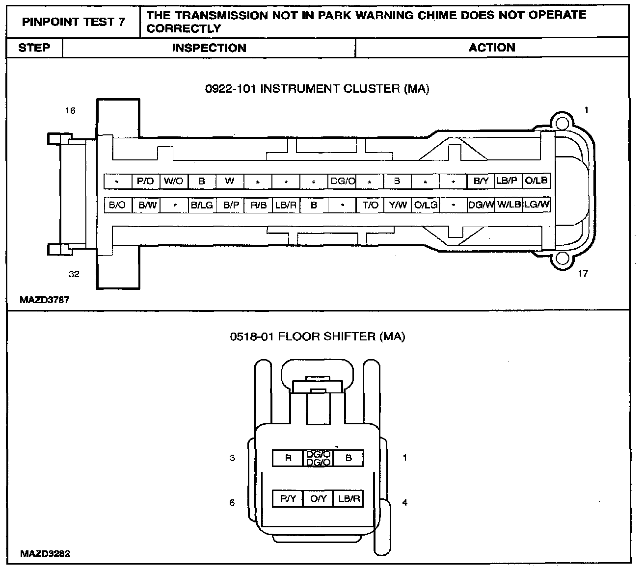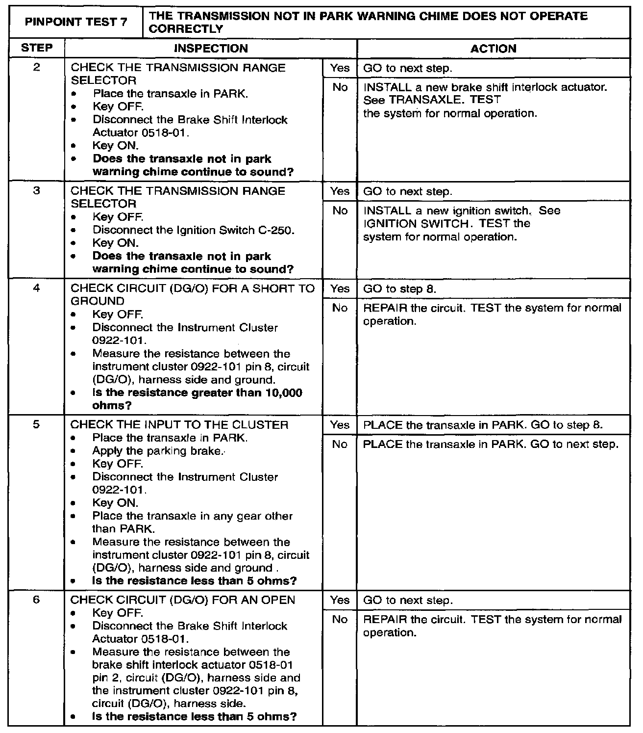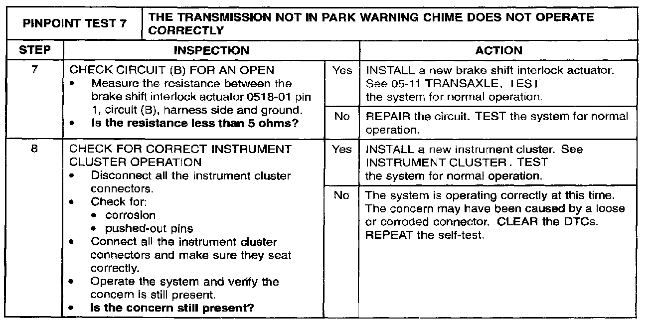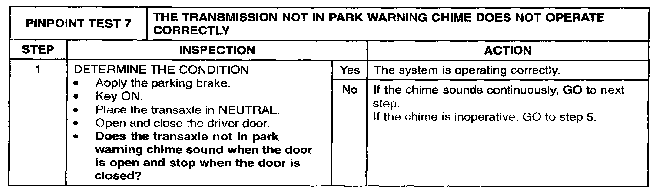 PINPOINT TEST 7: THE TRANSMISSION NOT IN PARK WARNING CHIME DOES NOT OPERATE CORRECTLYStep 1: