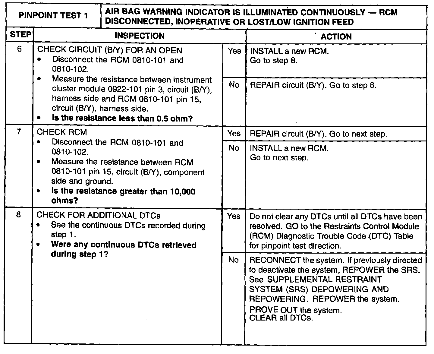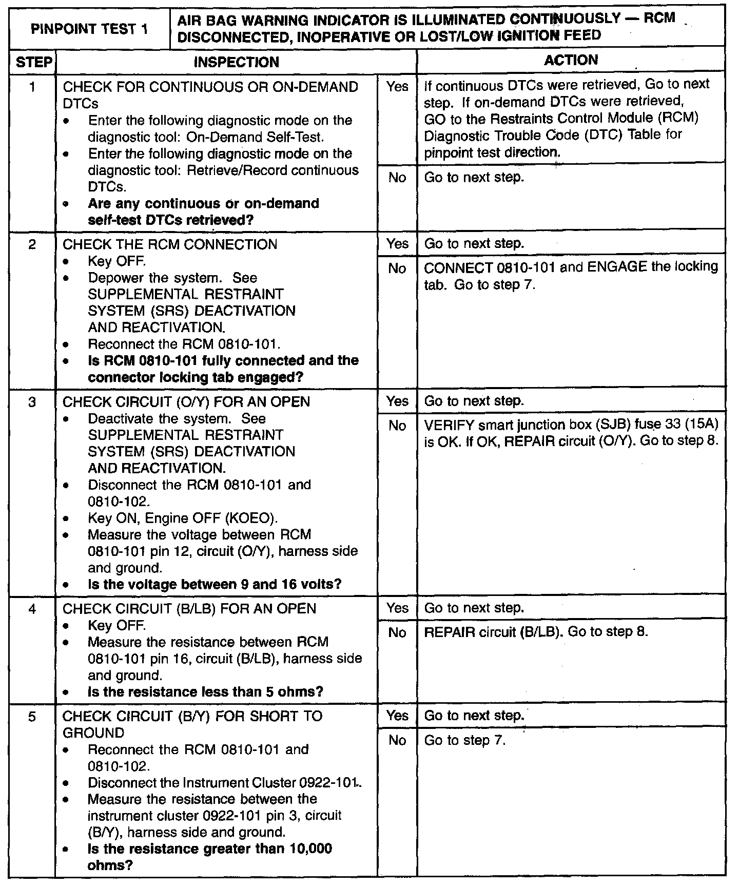 PINPOINT TEST 1: AIR BAG WARNING INDICATOR IS ILLUMINATED CONTINUOUSLY - RCM DISCONNECTED, INOPERATIVE OR LOST/LOW IGNITION FEEDNormal Operation