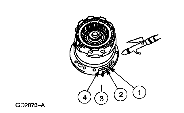 12. Check the following passages of the forward/coast/direct clutch cylinder and reverse clutch drum with moisture-free compressed air, regulated to 276 kPa (40 psi).