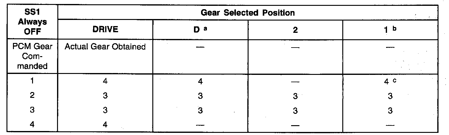 Shift Solenoid Failure Mode Chart Always OFFFailed OFF due to PCM and/or vehicle wiring concerns, and/or solenoid electrically stuck off, and/or hydraulically or mechanically stuck off.