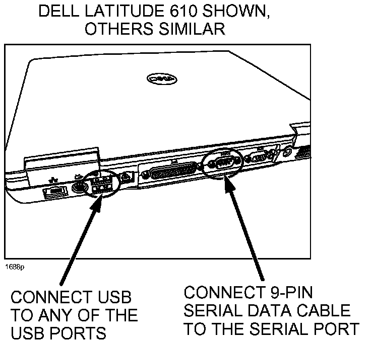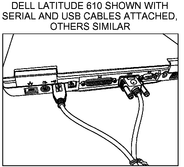 2. Connect 9-pin serial data cable and USB cable from flashing device to ports located on rear of computer (Dell Latitude 610 laptop shown, others similar).