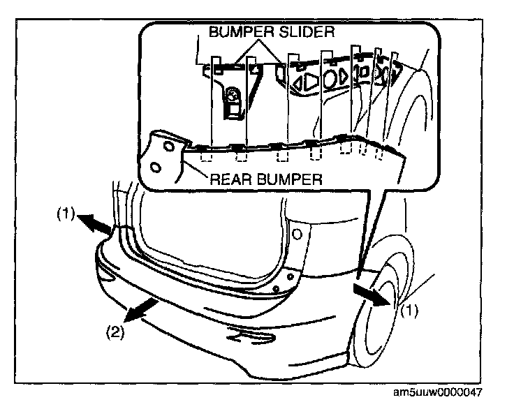 1. Pull the rear bumper ends (wheel arch) outward (1) to detach from the bumper slider.