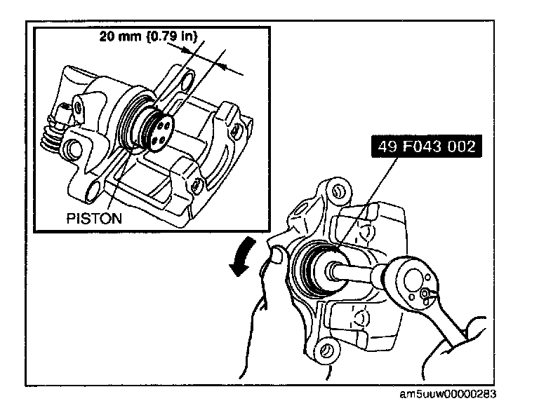 6. Rotate the SST in the direction of the arrow and push the piston completely into the caliper.