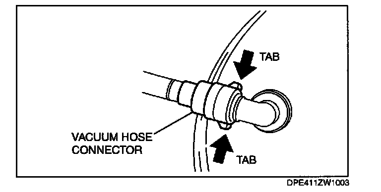 VACUUM HOSE REMOVAL/INSTALLATION1. Disconnect the vacuum hose connector from the power brake unit while pressing the tabs of the vacuum hose connector.