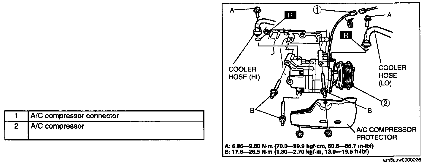 9. Remove in the order indicated in the table. Do not allow remaining compressor oil in the A/C compressor to spill.