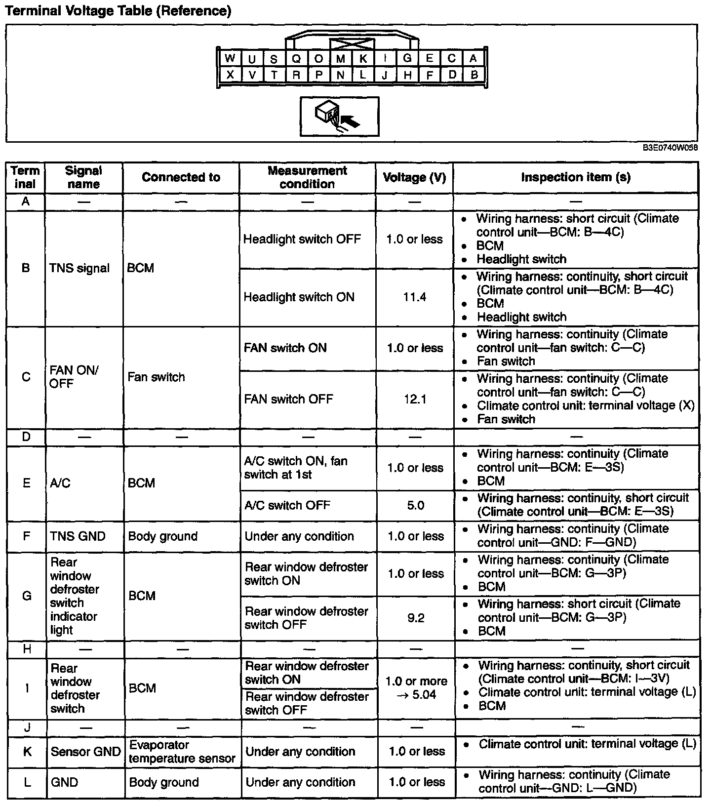 4. By inserting the positive (+) lead of the tester into each climate control unit terminal, measure the voltage according to the terminal voltage table.