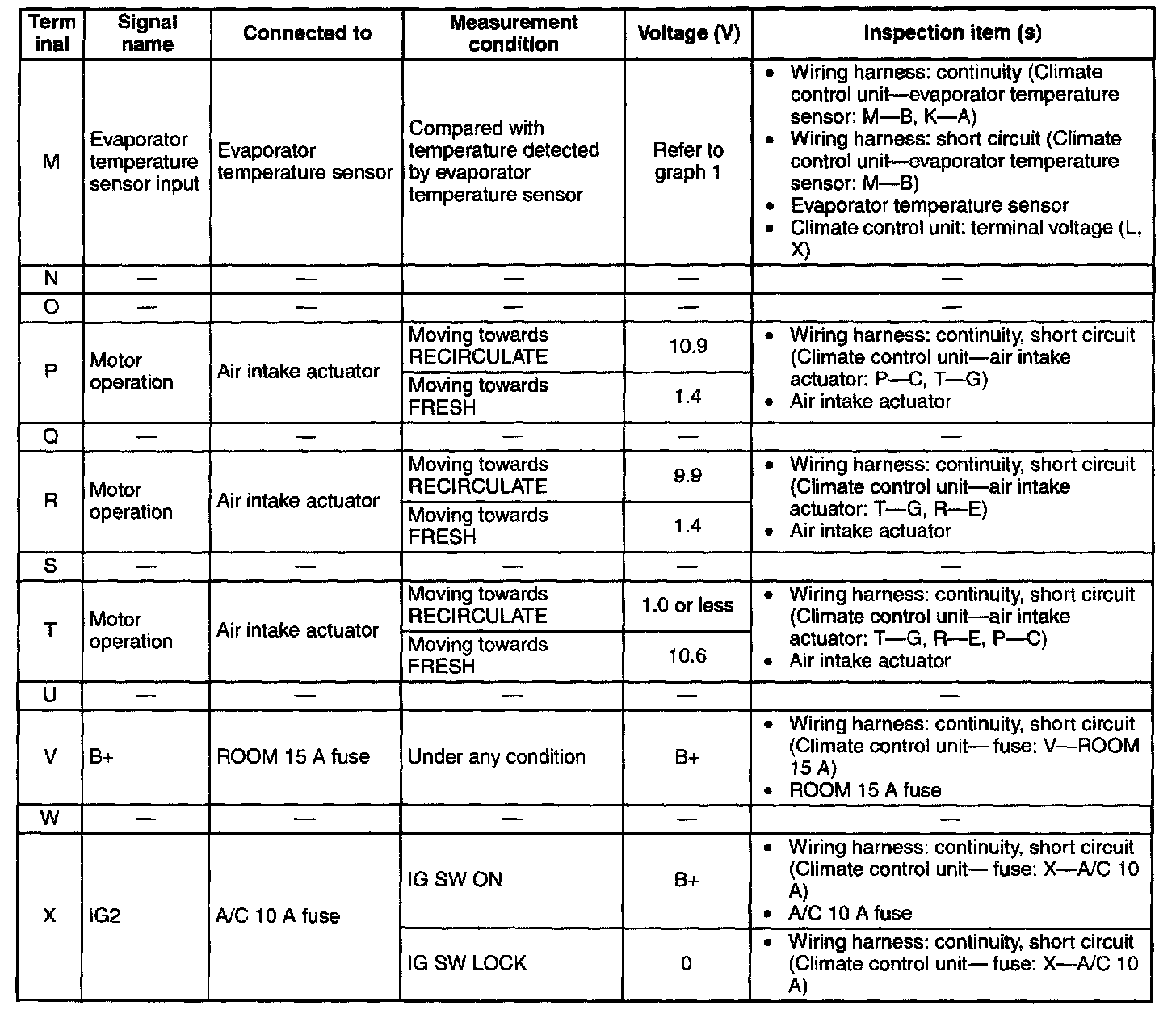 - If the parts under "Inspection item (s)" are found to be normal, replace the climate control unit.