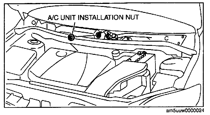 7. Remove the A/C unit installation nut from the engine compartment, then remove the A/C unit.
