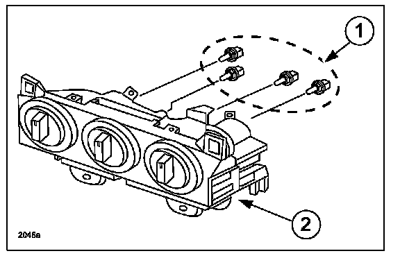 When you encounter a concern where the bulb (1) in the climate control unit (2) needs to be removed or replaced, make sure to install the bulb correctly. If not installed correctly, the bulb will generate excessive heat due to an insufficient connection, and may fail in a couple of months.