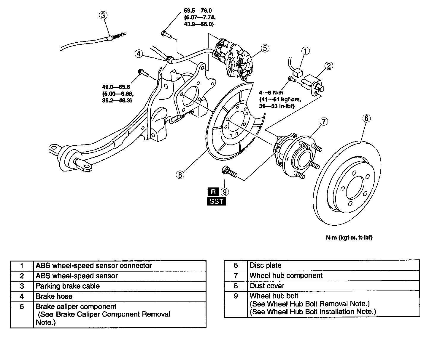 WHEEL HUB COMPONENT REMOVAL/INSTALLATIONCaution: Performing the following procedures without first removing the ABS wheel-speed sensor may possibly cause an open circuit in the wiring harness if it is pulled by mistake. Before performing the following procedures, disconnect the ABS wheel-speed sensor connector (body side) and fix the wiring harness to an appropriate place where it will not be pulled by mistake while servicing the vehicle.