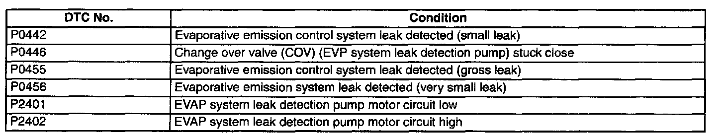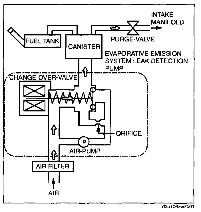 - The EVAP system test finds gas leaks in the system using the PCM to monitor changes in the air pump load current of the EVAP system leak detection pump. This test starts after sending an on-demand test signal from the M-MDS to the PCM. The PCM controls the air pump and change-over-valve operation and also stores the load current of the air pump as follows: