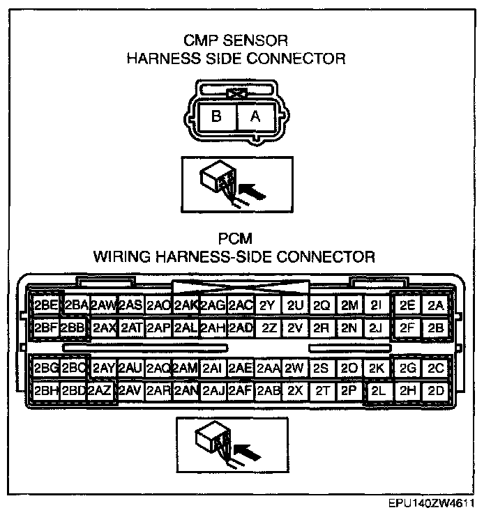 2. Measure the resistance between CMP sensor connector terminals A and B.
