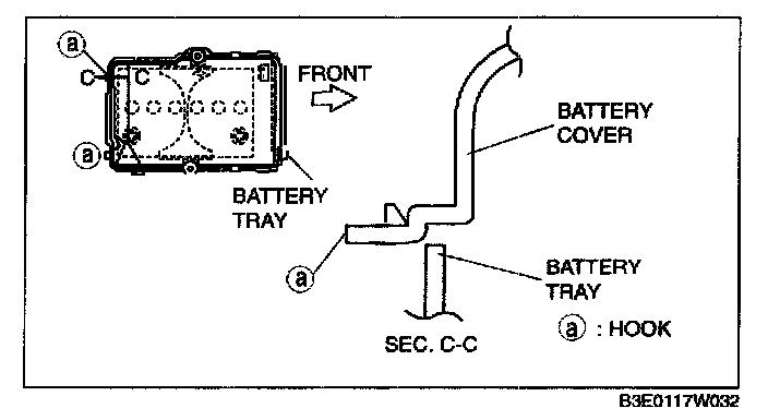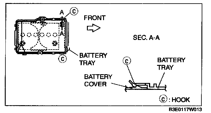 1. Assemble with battery box hooks E aligned with the battery tray holes at two points.
