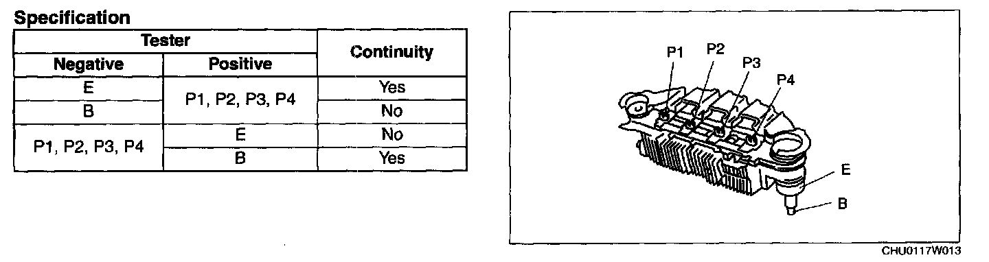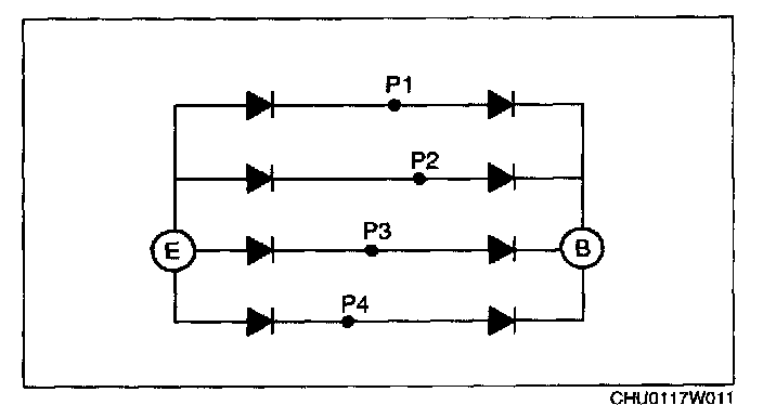 - When the electrical load of the vehicle is low, specified current will not be verified although the generator is normal. In this case, increase the electrical load (by turning on the headlight and leave it for a while, then discharge the battery or by similar methods) and recheck.