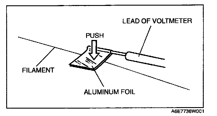 CAUTION: Directly touching the rear window defroster filament with the lead of the tester could damage it. Wrap aluminum foil around the end of the lead and inspect the filament by touching it with the foil.