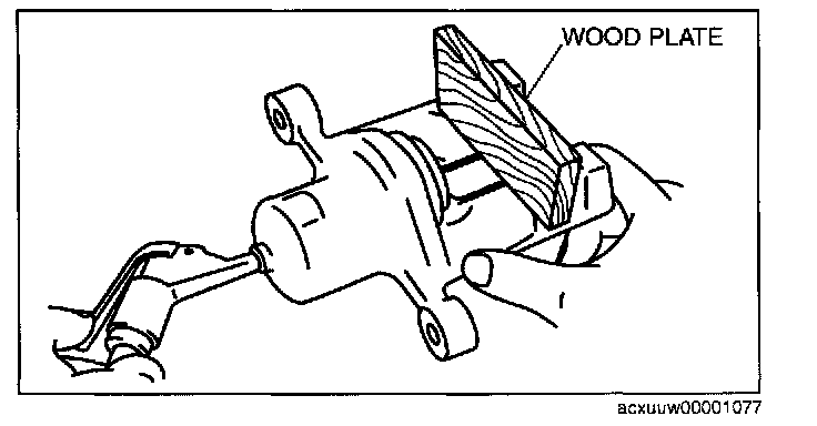 ^ When compressed air is blown into the caliper body, injury to a finger or other part from pinching could result from the piston springing up. When blowing in compressed air, do not place your fingers between the piston and caliper body when performing the work.