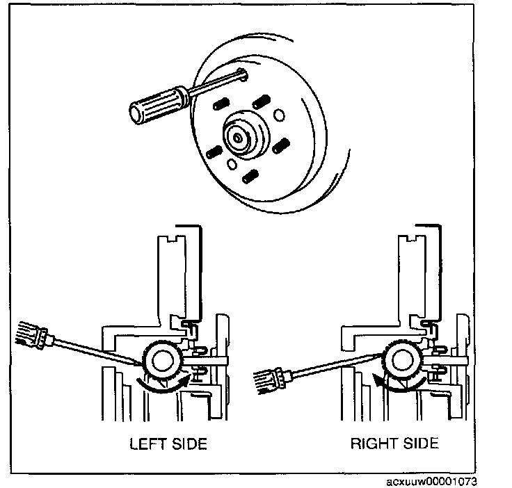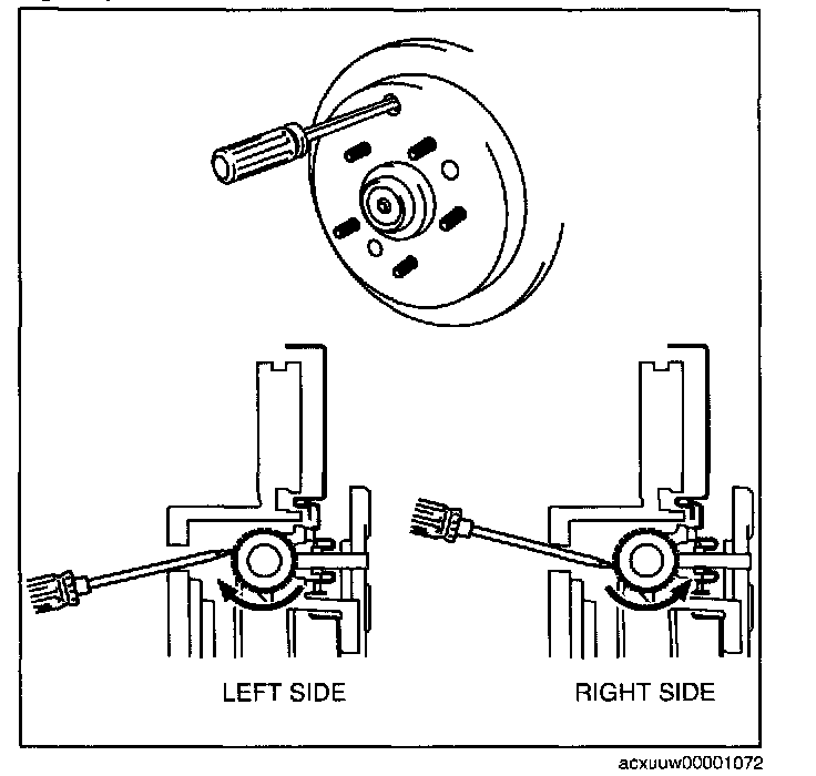 (1) Insert a flathead screwdriver into the service hole and turn the adjuster in the direction of the arrow to expand the parking brake shoe until the disc plate cannot rotate.
