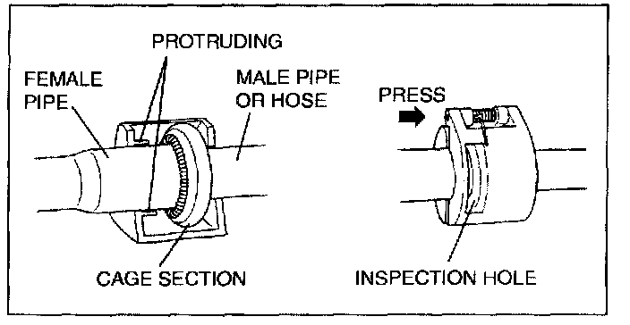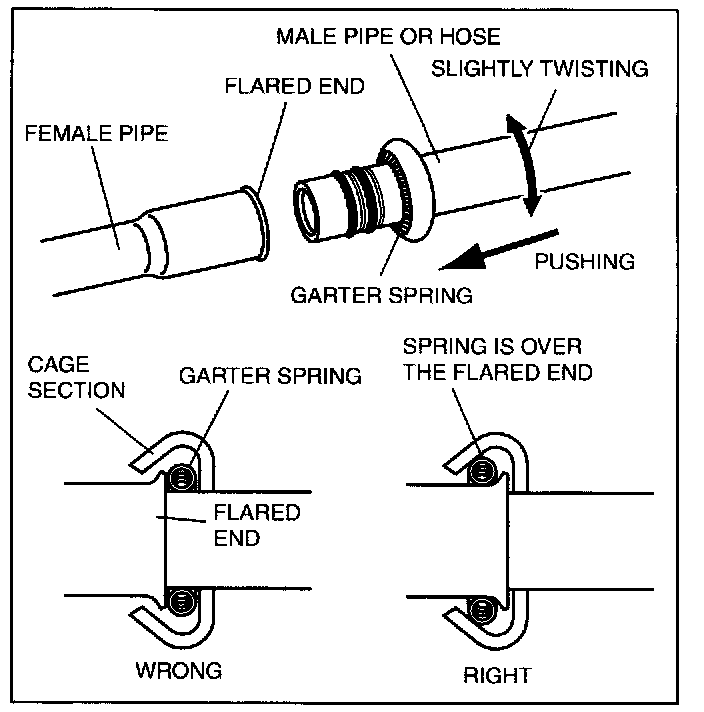 1. Connect the male pipe or hose by pushing it while slightly twisting it onto female pipe until the garter spring at the male pipe or hose is over the flared end of female pipe.