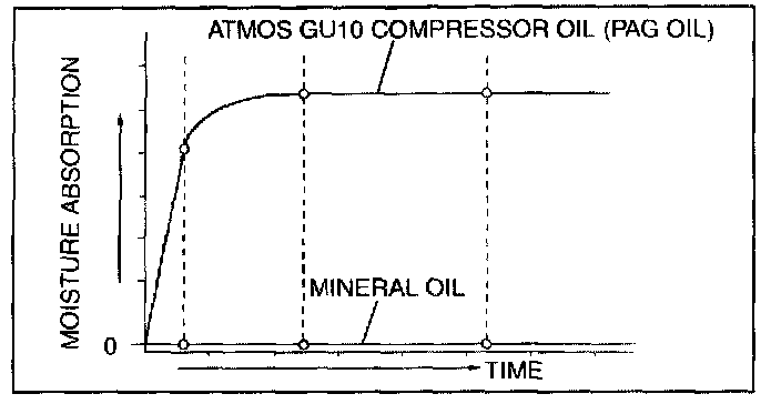 - ATMOS GU-10 compressor oil (PAG oil) has a higher moisture absorption efficiency than the previously used mineral oil. If moisture mixes with the compressor oil, the refrigerant system could be damaged. Therefore, install caps immediately after using the compressor oil or removing refrigerant system parts to prevent moisture absorption.