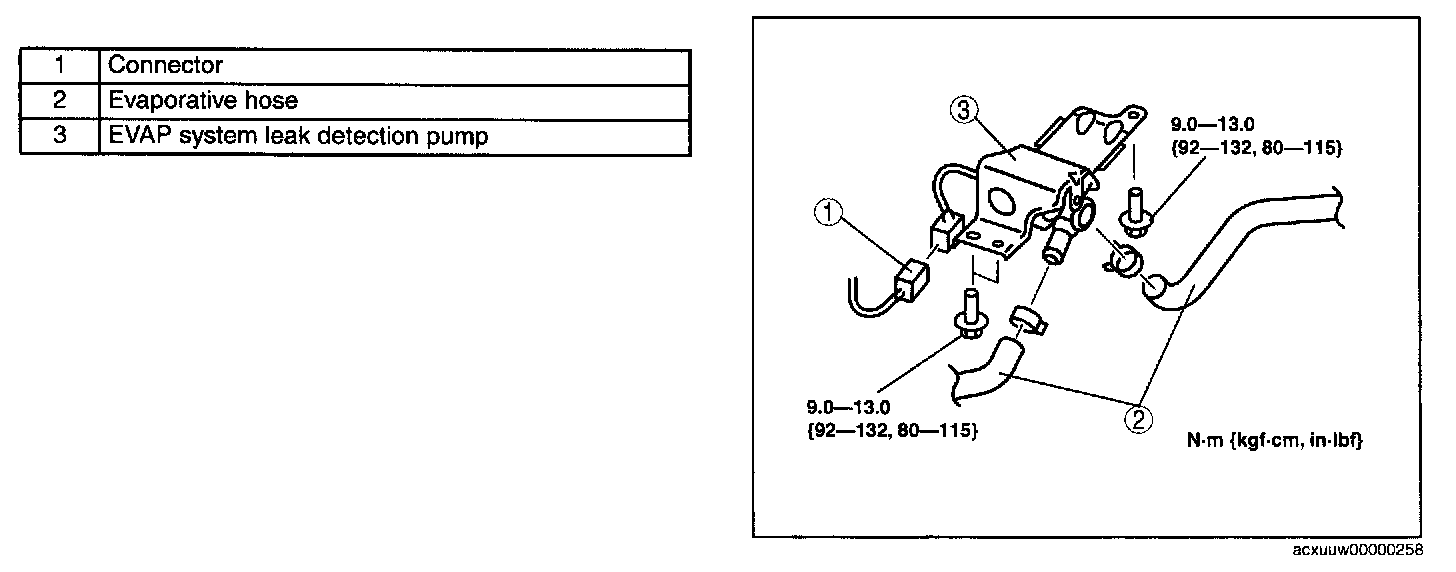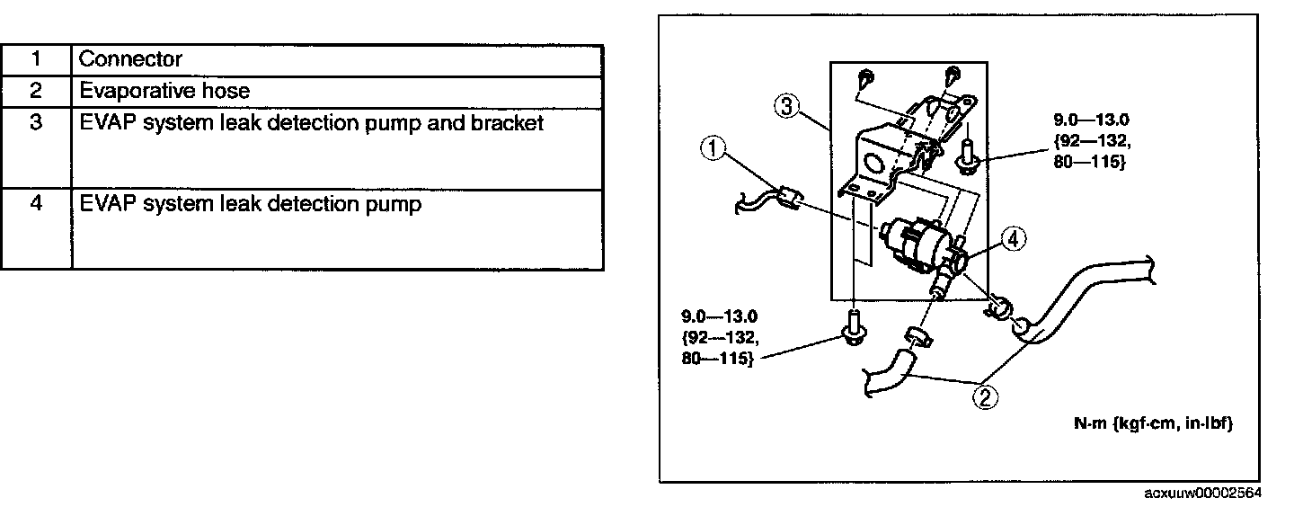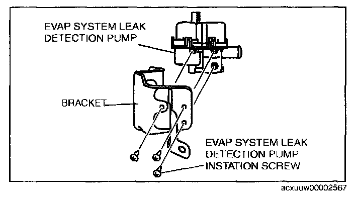NOTE: Because the AWD EVAP system leak detection pump is installed surrounded by the rear differential, there is insufficient space for removing the pump from the vehicle. Therefore, it is necessary to remove the EVAP system leak detection pump and bracket separately from the vehicle.