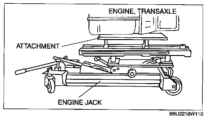 6. To firmly support the engine, first set the engine jack and attachment to the oil pan.