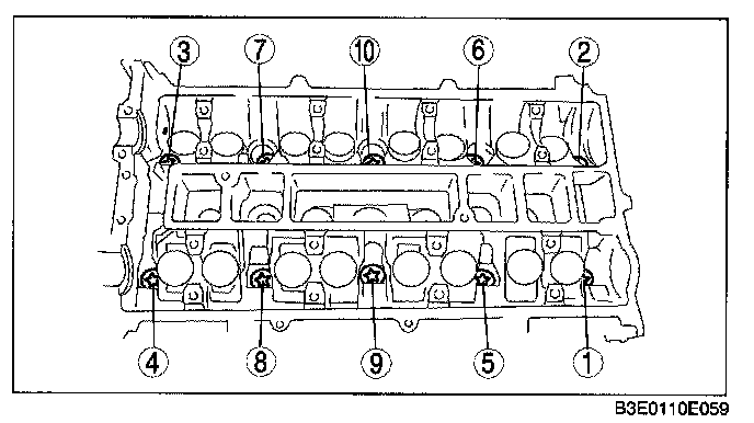 1. Loosen the cylinder head installation bolts in two to three passes in the order shown in the figure and remove them.