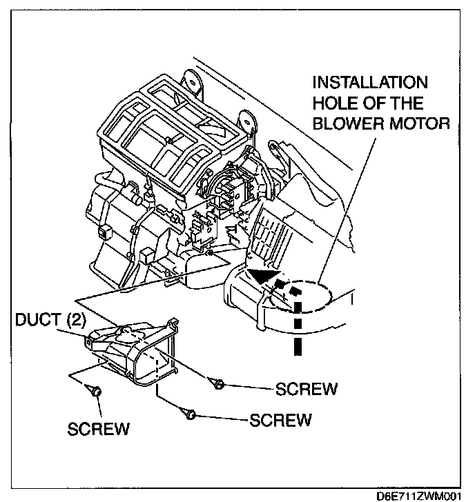 15. Install the duct (2) to the A/C unit by inserting a phillips screwdriver, with the screw, into the hole made after removing the blower motor.