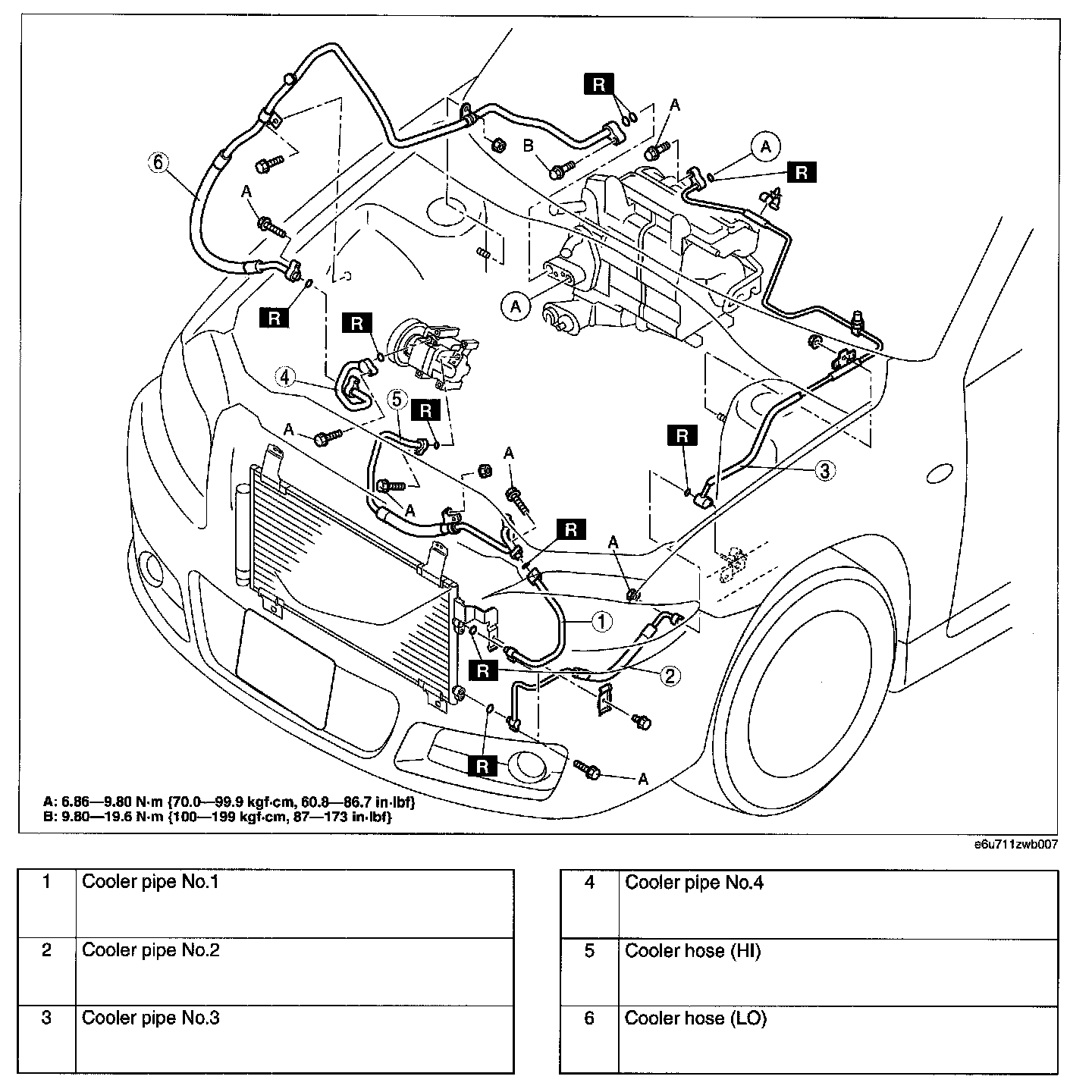 1. When installing a new cooler pipe No.4 or cooler hose (LO), add a supplemental amount of ATMOS GU1O compressor oil into the refrigeration cycle.