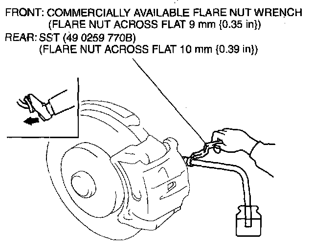 4. While the brake pedal is depressed, the other should loosen the bleeder screw using the SST or any commercially available flare nut wrench, drain out any fluid containing air bubbles, and tighten the bleeder screw.