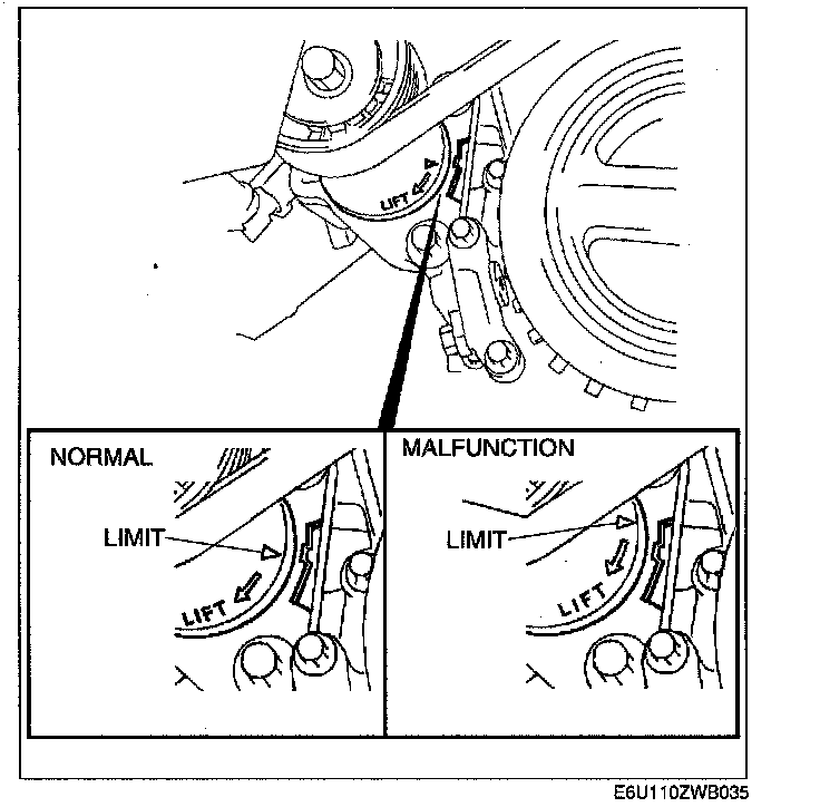1. Verify that the drive belt auto tensioner indicator mark does not exceed the limit.