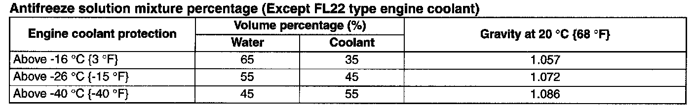 Antifreeze Solution Mixture Percentage (Except FL22 Type Engine Coolant):