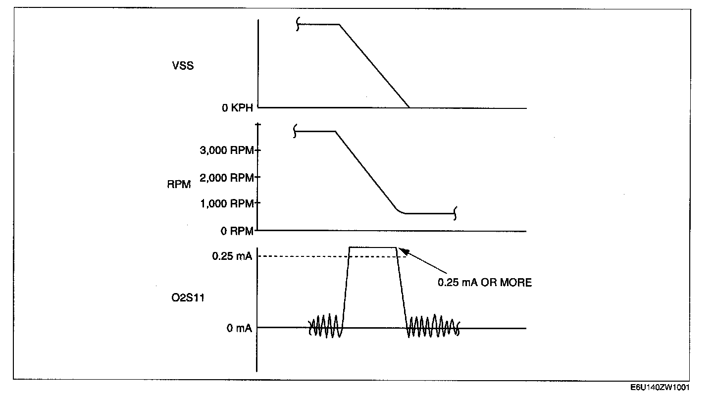 4. Verify that the front HO2S current (PID: 02S11) is 0.25 mA or more while decelerating as shown in the figure.