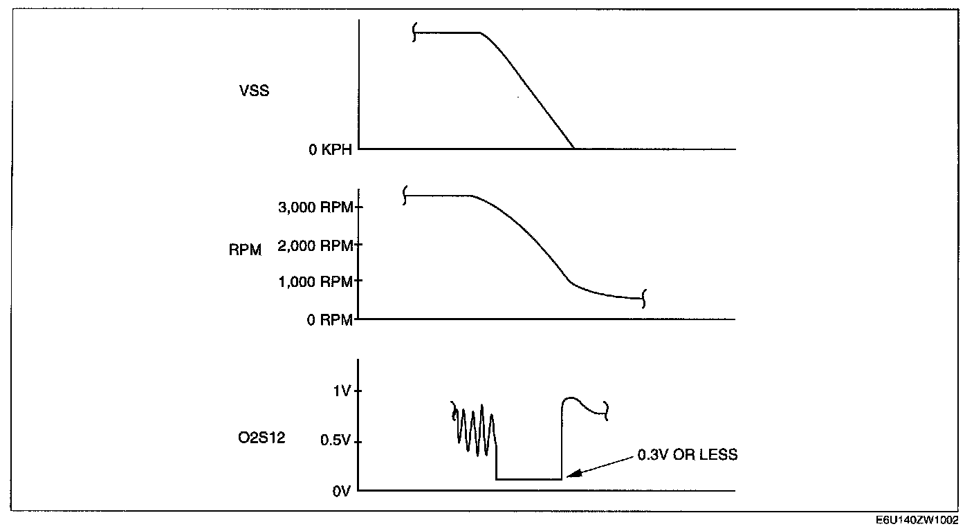 4. Verify that the rear HO2S outputs a voltage of 0.6 V or more, one time or more, then verify that the rear HO2S voltage (PID: 02S12) is 0.3 V or less while decelerating as shown in the figure.