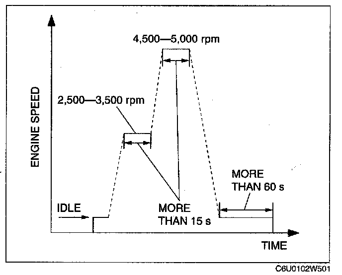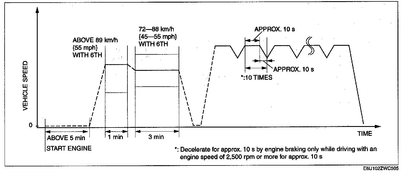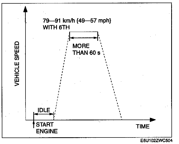 6. Drive the vehicle at an engine speed of 65-30 km/h {40-50 mph} for more than 5 mm.