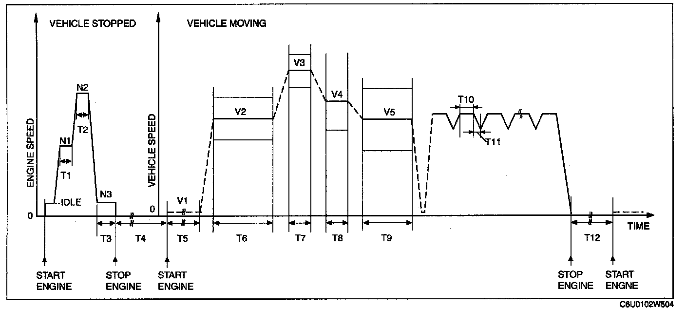5. With the vehicle stopped, race the engine at the engine speed indicated, and then drive the vehicle as shown in the graph. The driving conditions before driving at constant speed are not specified. If possible, monitor RPM PID for engine speed during this procedure.